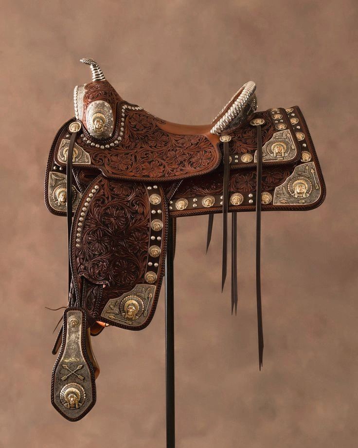 Decorative Show SaddleIntricate hand tooling, silver or brass accentsExhibitions, parades, giftsFull custom engraving