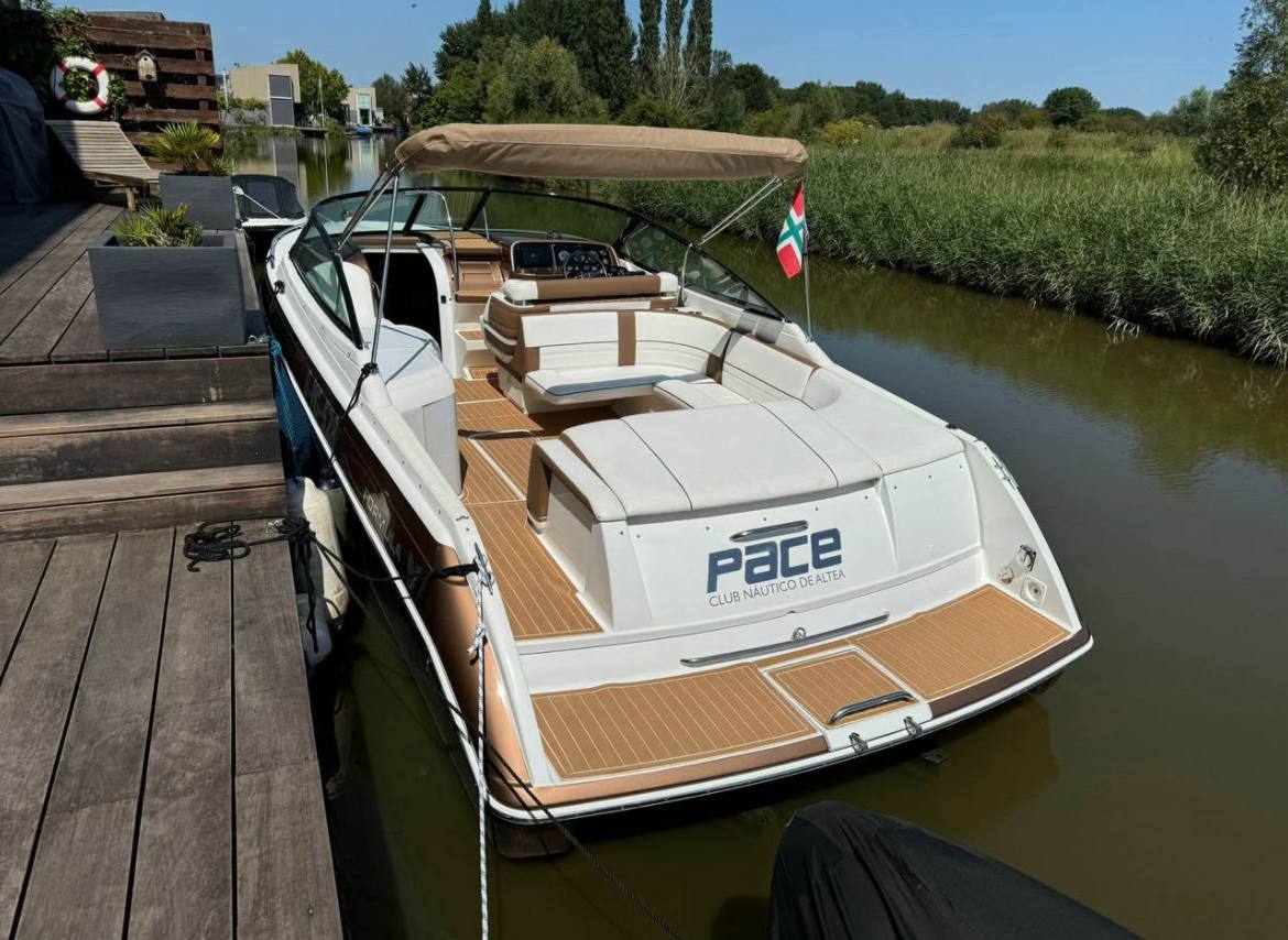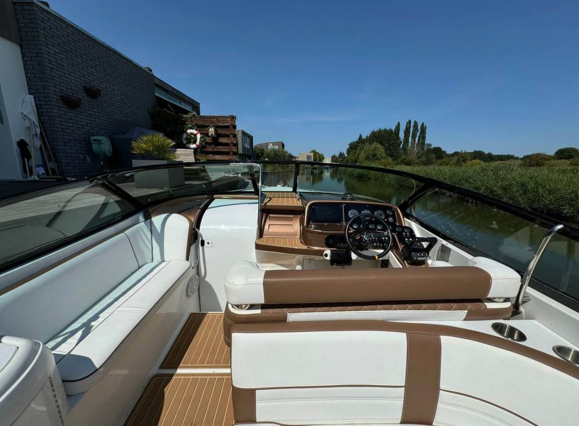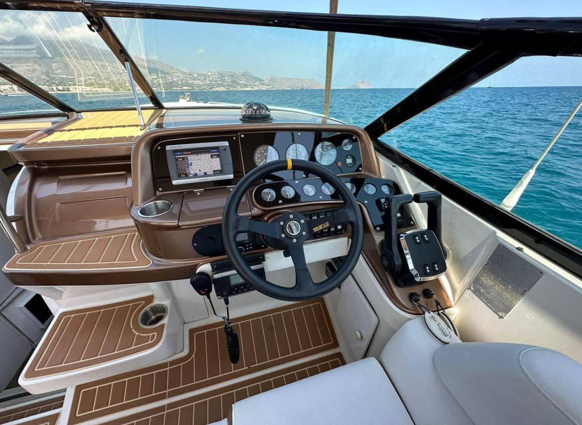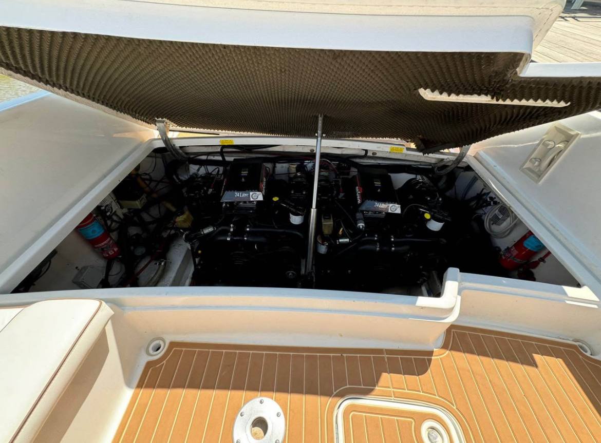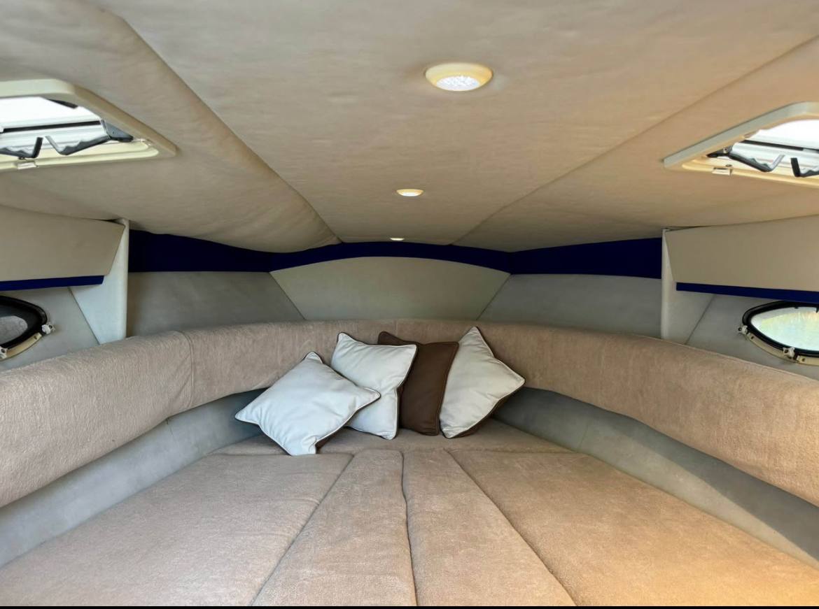 She’s powered by her original twin MerCruiser 7.4 liter engines (each putting out 360hp) with the factory injection system still in place – smooth, strong, and ready to push her to exciting speeds while the deep-V hull slices through chop with confidence. Length is a perfect 10 meters, beam 3 meters, and 2.2 meters of headroom inside so everyone moves around easily.